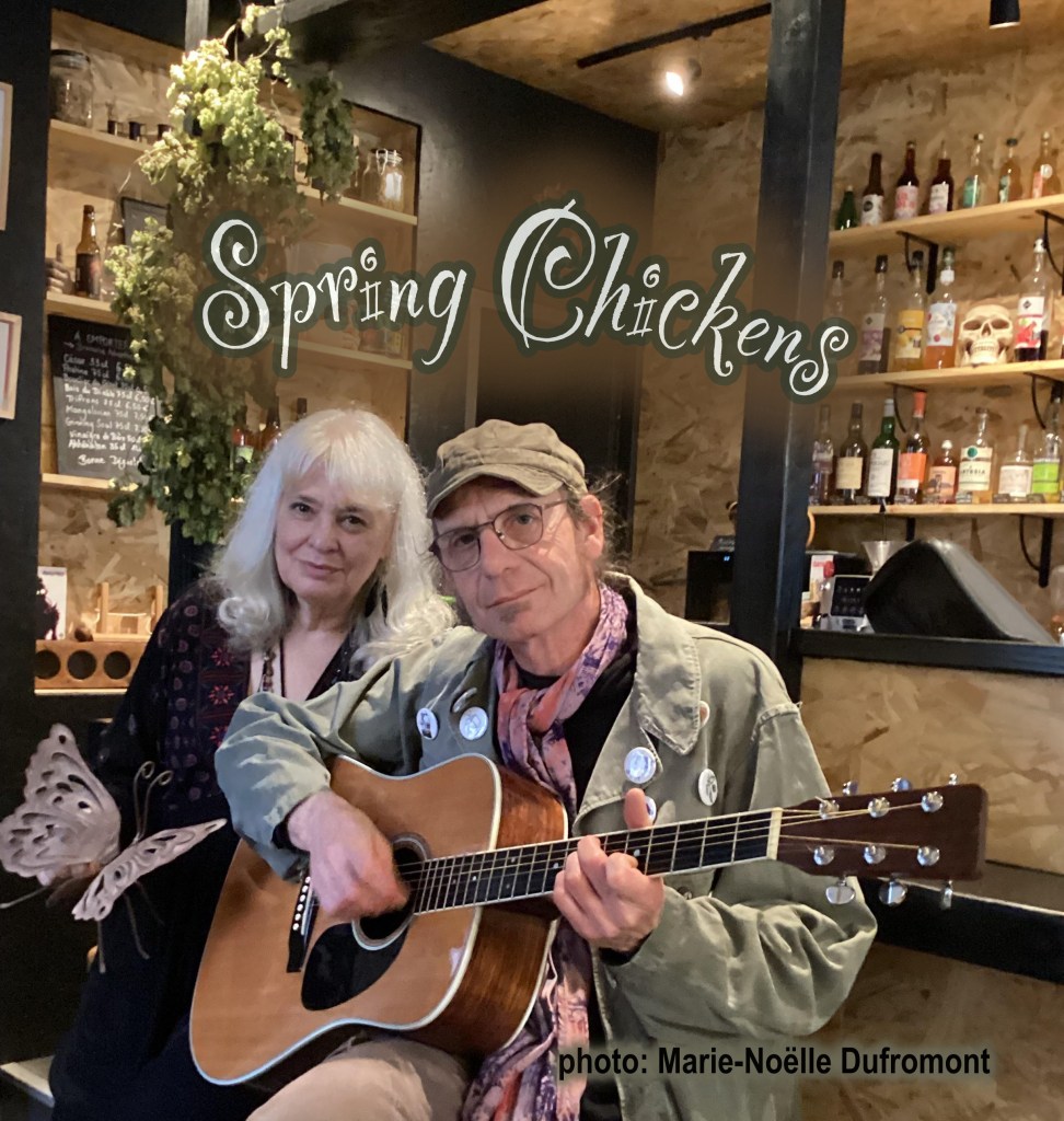 The Spring Chicken repertoire includes songs by Joni Mitchell, Bob Dylan, John Prine, Steve Goodman, Joan Baez, Phil Ochs, Crosby Stills Nash and Young, Jimi Hendrix, the Grateful Dead and more.
